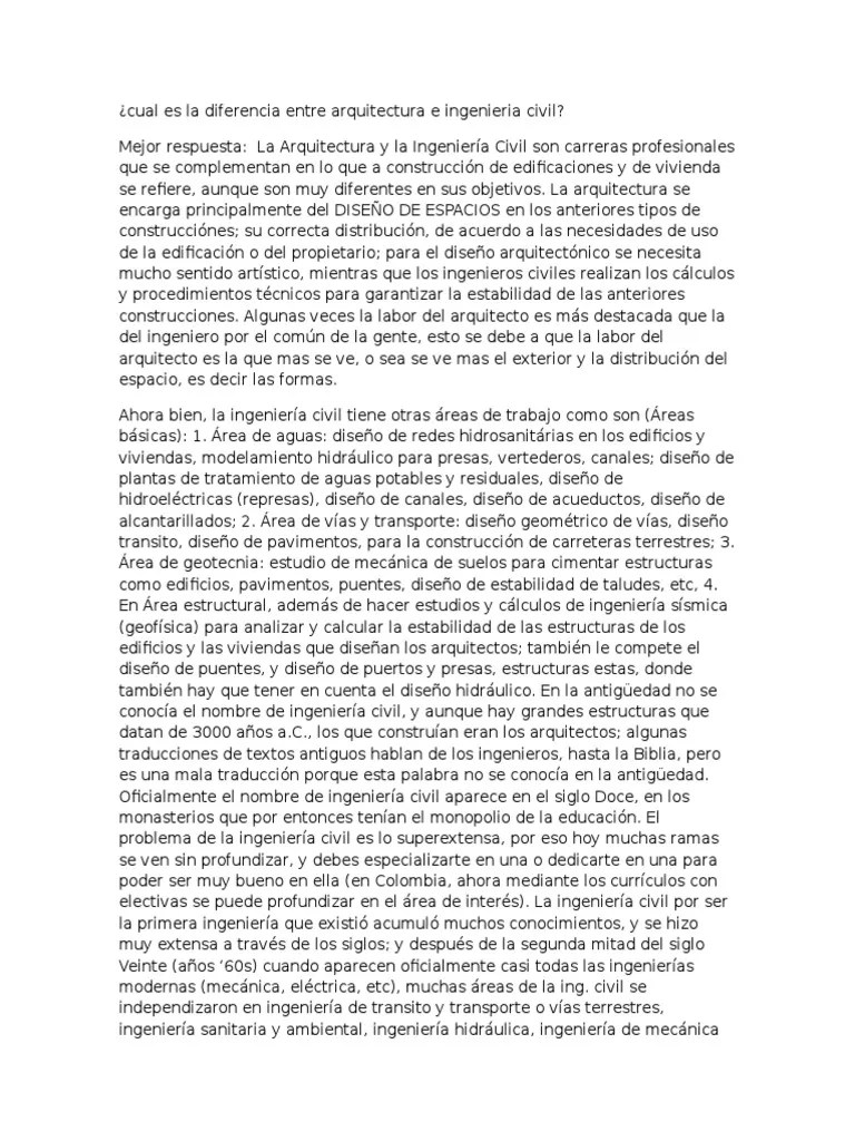 Mar 23, 2018 · el ingeniero civil se dedica a estudiar detalladamente cada aspecto dentro de una estructura, para darle funcionalidad, economía y ahorro de tiempo, por ejemplo, estudia las tuberías de un edificio, el sistema eléctrico, etc... Acá te comentamos acerca de sus diferencias. Muchas veces nos preguntamos ¿q. En este video podrán conocer la diferencia entre arquitectura e ingenieria civil 2021 de una manera resumida y simple. En cuestión a trabajo, ambas carreras son solicitadas.. Acá te comentamos acerca de sus diferencias.